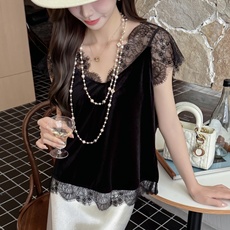 简约金丝绒短袖V领t恤女法式黑色修身上衣丝绒拼蕾丝钉珠打底衫