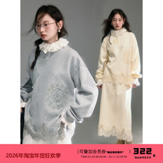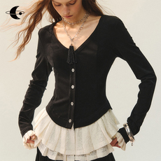 创世纪元【黑韵边章】套装女装冬羊毛蕾丝拼接V领上衣+花边半裙