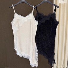高端欧货冬季新款蕾丝拼接侧开叉不规则丝绒可调节吊带连衣裙女