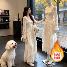 甜辣妹不规则蝴蝶镂空罩衫挂脖蕾丝连衣裙女春秋叠穿漂亮两件套装