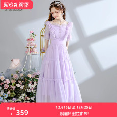 艾丽丝2025夏季新款紫色网纱印花A字裙女仙气蕾丝V领中长款连衣裙
