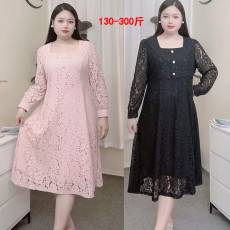 200秋季韩版300斤特大码女装胖mm洋气显瘦遮肚蕾丝长袖A字连衣裙