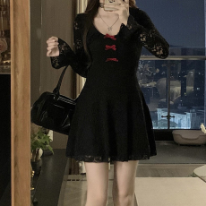 盈可人秋冬新款低胸蕾丝镂空包臀裙气质性感成熟纯色打底连衣裙
