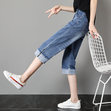 高腰弹力七分牛仔裤女小脚夏季薄款中年妈妈7分中裤修身直筒马裤