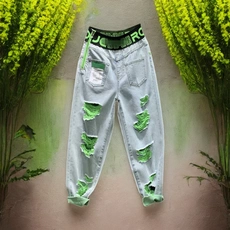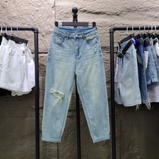 2023春夏新款蓝色破洞牛仔裤女薄款九分宽松高腰显瘦哈伦萝卜裤子