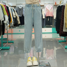 天丝牛仔九分裤女夏季薄款哈伦裤松紧腰韩版简约做旧风复古束脚裤