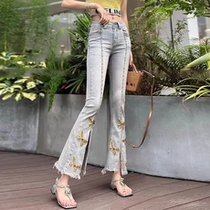 刺绣牛仔裤女夏薄款2025新款阔腿宽松大码胖mm显瘦裤子直筒九分裤