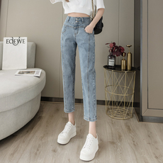 欧货夏季薄款蓝色破洞牛仔裤女九分宽松高腰显瘦哈伦老爹裤子百搭