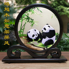 蜀绣双面绣大熊猫屏风手工刺绣摆件鸡翅木如意架礼品礼物成都特产