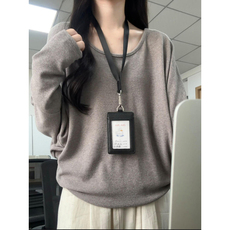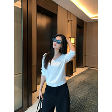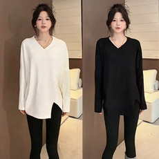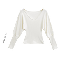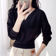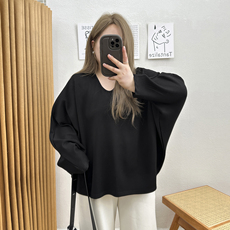 时尚V领蝙蝠袖小衫女士2024新款宽松圆领纯色遮肚显瘦上衣T恤衫