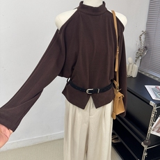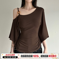 ROCKMORE【中古风】单肩串珠吊带蝙蝠袖棕色上衣显瘦露肩性感T恤