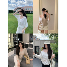 黑色露肩短袖防晒T恤女装春季设计感休闲薄款蝙蝠袖宽松罩衫上衣