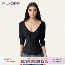 FUNOFF 美式简约V领黑色蝙蝠袖收腰针织T恤百搭显瘦低胸中袖上衣