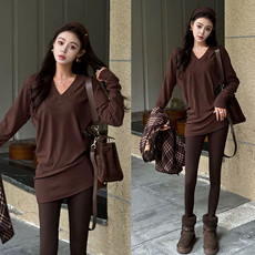 不规则磨毛蝙蝠袖V领T恤裙女秋冬中长款遮屁股保暖长袖打底衫上衣