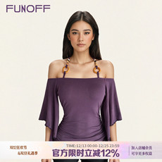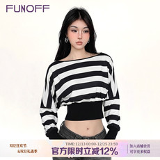 FUNOFF 美式复古黑白条纹斜肩收腰长袖T恤2025秋蝙蝠袖一字肩上衣