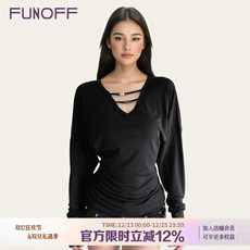 FUNOFF 美式复古黑色V领低胸串珠长袖T恤性感收腰蝙蝠袖打底上衣