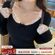 黑色蕾丝针织打底衫女内搭修身2024新款白色圆领毛衣洋气低领上衣