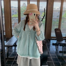 双层纱纯色尖领衬衫通勤休闲宽松单排扣长袖上衣2045