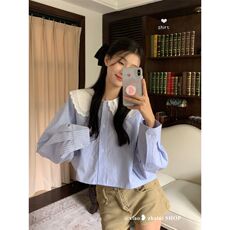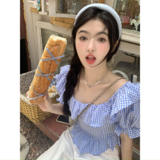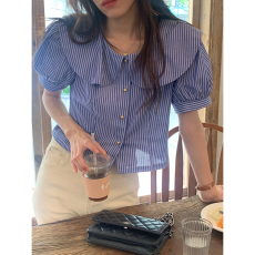 范雯雯 南法假日 法式甜美少女荷叶娃娃领衬衫泡泡袖短款条纹上衣
