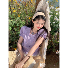 2023年春夏新款复古镂空蕾丝短袖衬衫女短款洋气百搭显瘦方领上衣