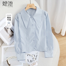 大码女装春秋新款时尚娃娃领法式气质短款棉麻衬衫长袖百搭小衫潮