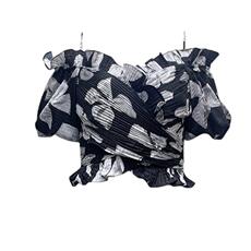 一字肩荷叶边收腰衬衫女设计感别致甜美短款修身泡泡袖短袖上衣夏