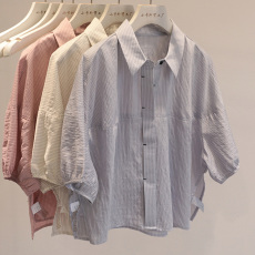 网红款通勤上班~韩系条纹短袖衬衫女夏季时尚轻薄宽松短款小衫
