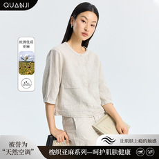 柔软舒适100%亚麻七分袖圆领短款衬衫夏季女薄宽松简约小开衫外套