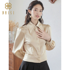 花吉B534芥绿天丝垂感西装翻领衬衫女2025新款秋长袖短款学院衬衣