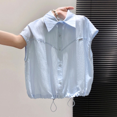 polo领雪纺衬衫女宽松2025夏季新款高级感抽绳显瘦短款无袖小上衣