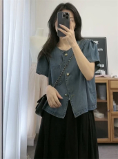 良良家设计感木耳边泡泡袖牛仔衬衫女夏季新款复古气质短款上衣