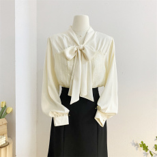 系带蝴蝶结长袖衬衫女2025春季设计感亮片拼接短款飘带雪纺衫上衣