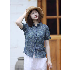 夏季文艺宽松短袖苎麻印花衬衣女士简约凉爽衬衫别致碎花上衣薄