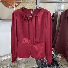 欧洲站2025秋冬款韩版翻领系带立体花朵单排扣通勤长袖衬衫5051
