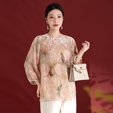 高端洋气真丝衬衫女长袖2025春加肥加大码宽松印花圆领桑蚕丝上衣