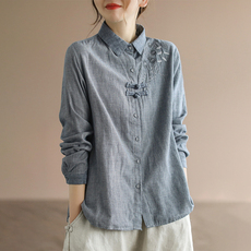 复古刺绣长袖棉麻衬衫女2025夏新款妈妈宽松休闲衬衣高端亚麻上衣