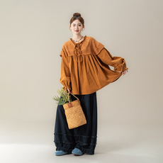 焦糖色碎花刺绣系带长袖衬衫女秋季新款斗篷式镂空设计感宽松上衣