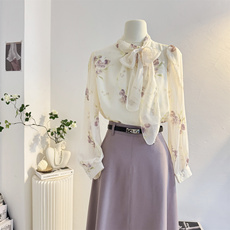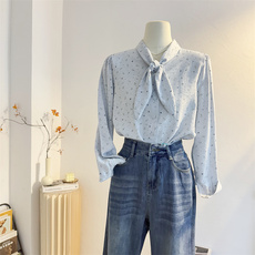 法式温柔系带蝴蝶结碎花长袖衬衫女2025秋季减龄印花雪纺小衫上衣