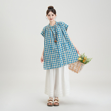蓝色复古格纹碎花短袖衬衫女夏季新款叠穿蕾丝拼接宽松阔腿裤套装