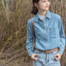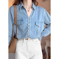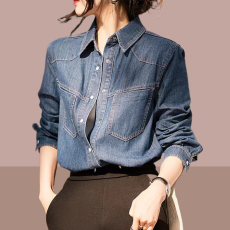 莉之绮简约时尚翻领牛仔衬衫春装新款宽松显瘦单排扣衬衣女230055