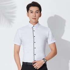 夏季薄款短袖白衬衫男青年商务休闲职业工装拼接内黑领白衬衣半袖