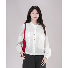 艺野系小个子天丝棉圆领双口袋短款白色长袖衬衫女秋季工装风上衣