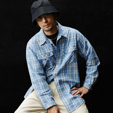 SUPERTOFU 蓝白格纹 垂感透气 工作双口袋 长袖工装衬衫 AW25