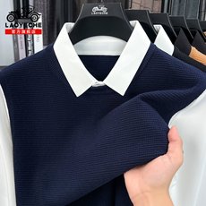 2025秋冬季男士假两件毛衣条纹拼接商务休闲衬衫领男装上衣针织衫