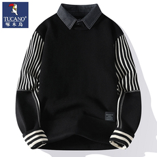 啄木鸟假两件针织衫男士冬季加绒加厚衬衫领毛衣男高端打底上衣潮
