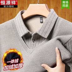 恒源祥冬季假两件毛衣男中年衬衫领加绒加厚保暖爸爸装针织打底衫