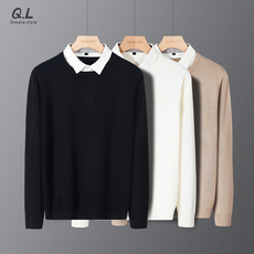 高端衬衫领毛衣男秋冬厚款男装纯色休闲假两件针织衫套头打底潮流