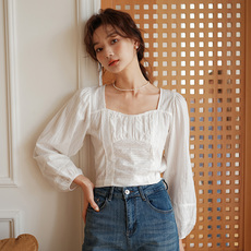 春装2025年新款法式别致设计感洋气蕾丝花边领子衬衫泡泡袖上衣女
