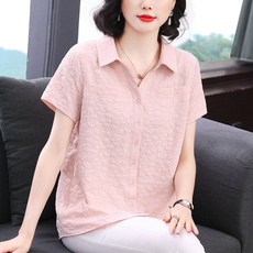 中年妈妈纯棉短袖衬衫女宽松翻领减龄POLO衫夏装休闲半袖T恤衬衣