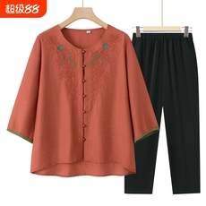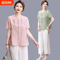 妈妈刺绣衬衫新款夏装中老年人上衣女士夏季套装洋气高贵国风小衫